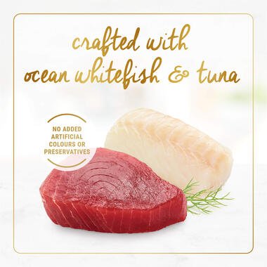- A protein-rich meal specially curated with real, high quality whitefish and tuna finely ground into a luscious and velvety paté-like texture that is irresistibly soft and smooth.