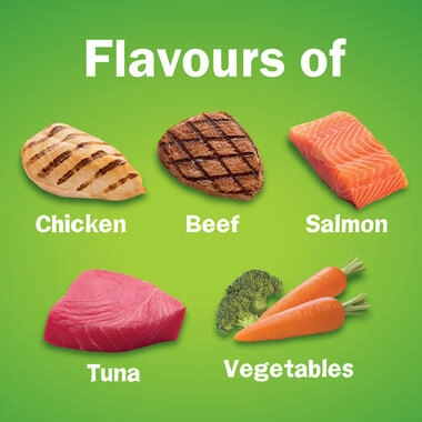 - Salmon, Tuna, Chicken, Beef & Vegetables Flavour.