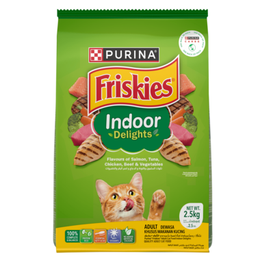 FRISKIES® Adult Indoor Delights Dry Cat Food is formulated to promote healthy weight and help control hairballs with flavours of salmon, tuna, chicken, beef and vegetables that your cat will enjoy! FRISKIES Indoor Delights provides your cat a complete and balanced nutrition, contains protein, essential fatty acids with Omega 3 & 6, antioxidants and taurine to meet your cat’s daily nutrition needs.