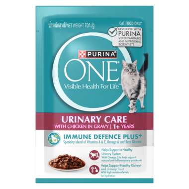 PURINA ONE® Wet Cat Adult Urinary Care with Chicken supports your cat’s overall immunity with IMMUNE DEFENCE PLUS+ and a specialty blend of beta glucans, Vitamins A & E, and Omega 6 fatty acids.