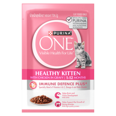 PURINA ONE® Wet Healthy Kitten with Chicken supports your cat’s overall immunity with IMMUNE DEFENCE PLUS+ and a specialty blend of beta glucans, Vitamins A & E, and Omega 6 fatty acids.